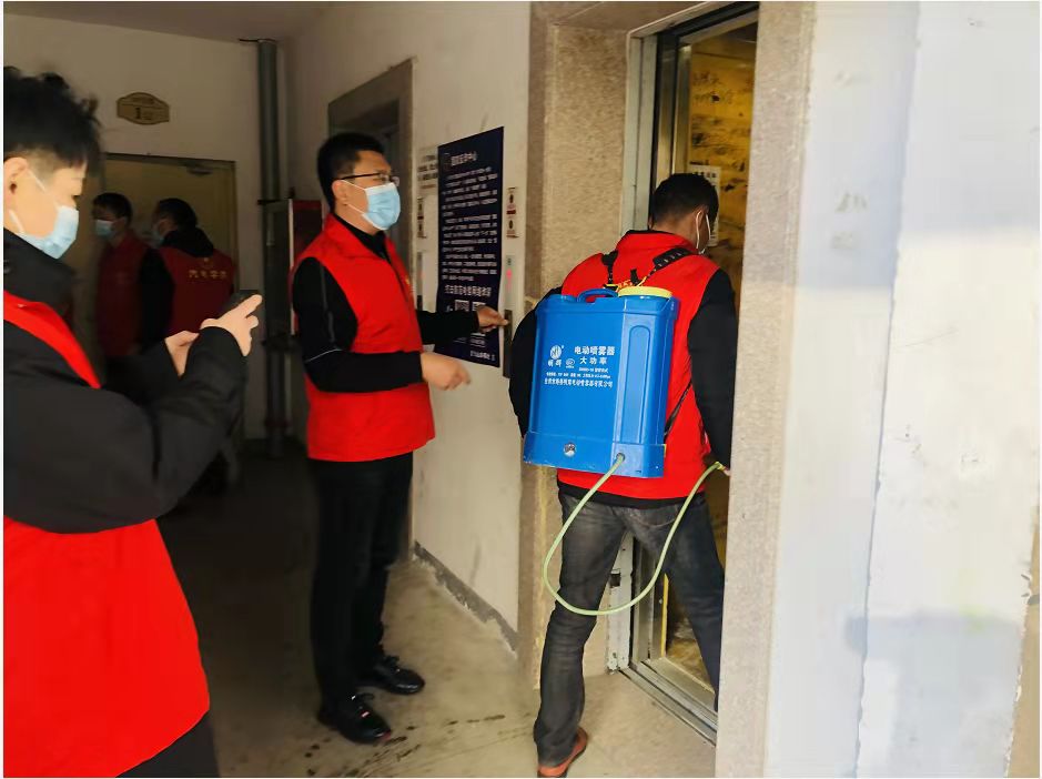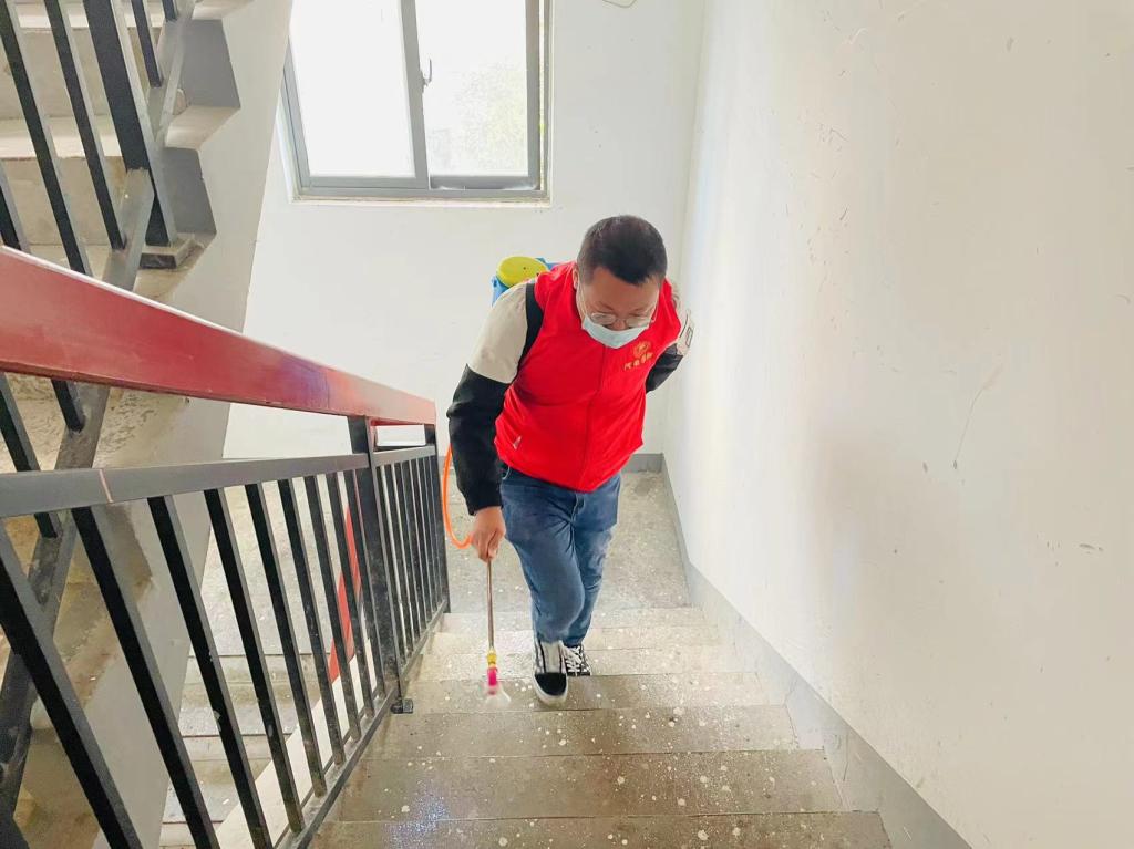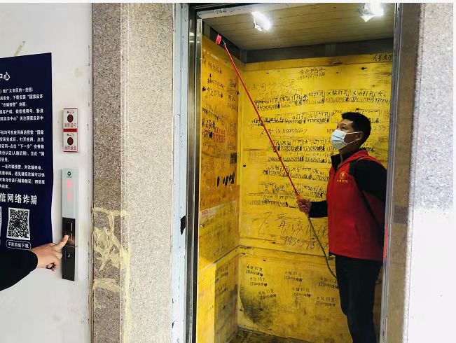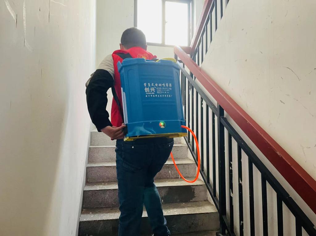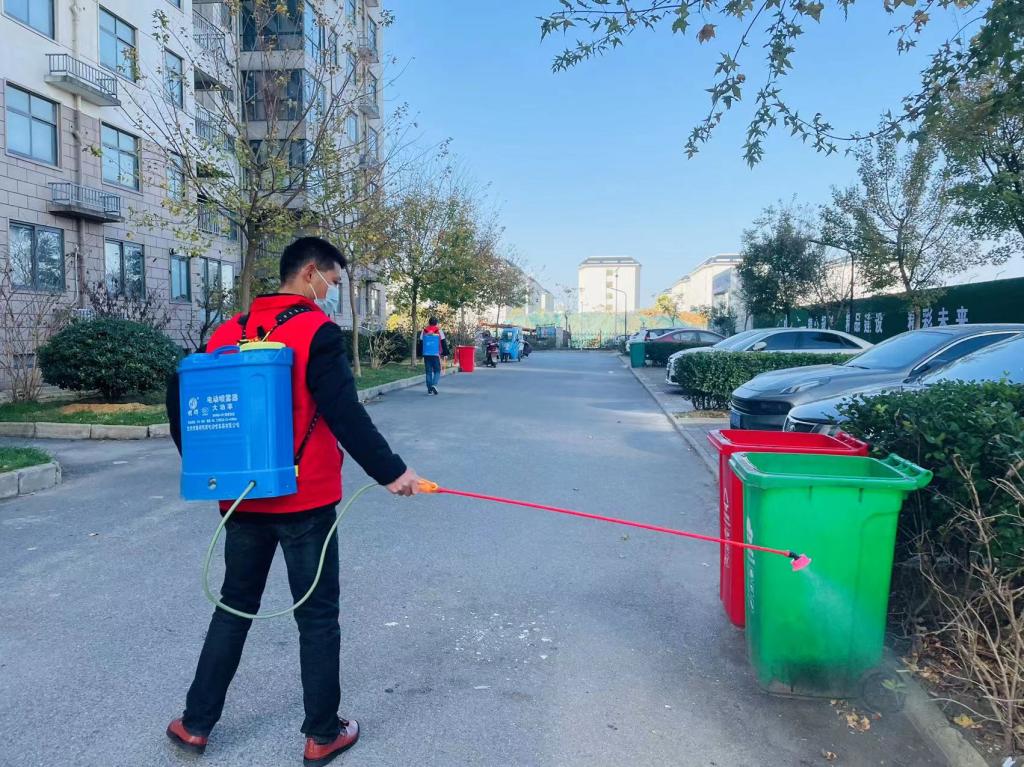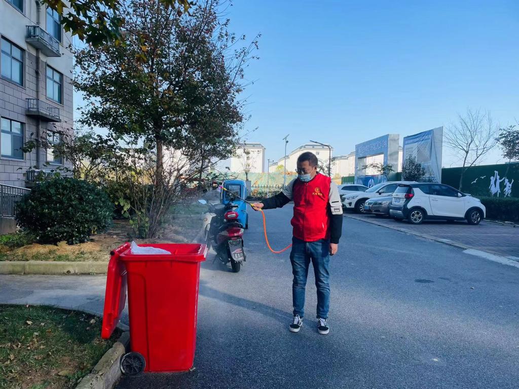 为了配合社区清除卫生死角和垃圾杂物,有效治理病媒生物孳生地,党员志愿者肩背消毒罐,对楼寓口、电梯厢、垃圾桶、道路两侧等地进行集中消杀。