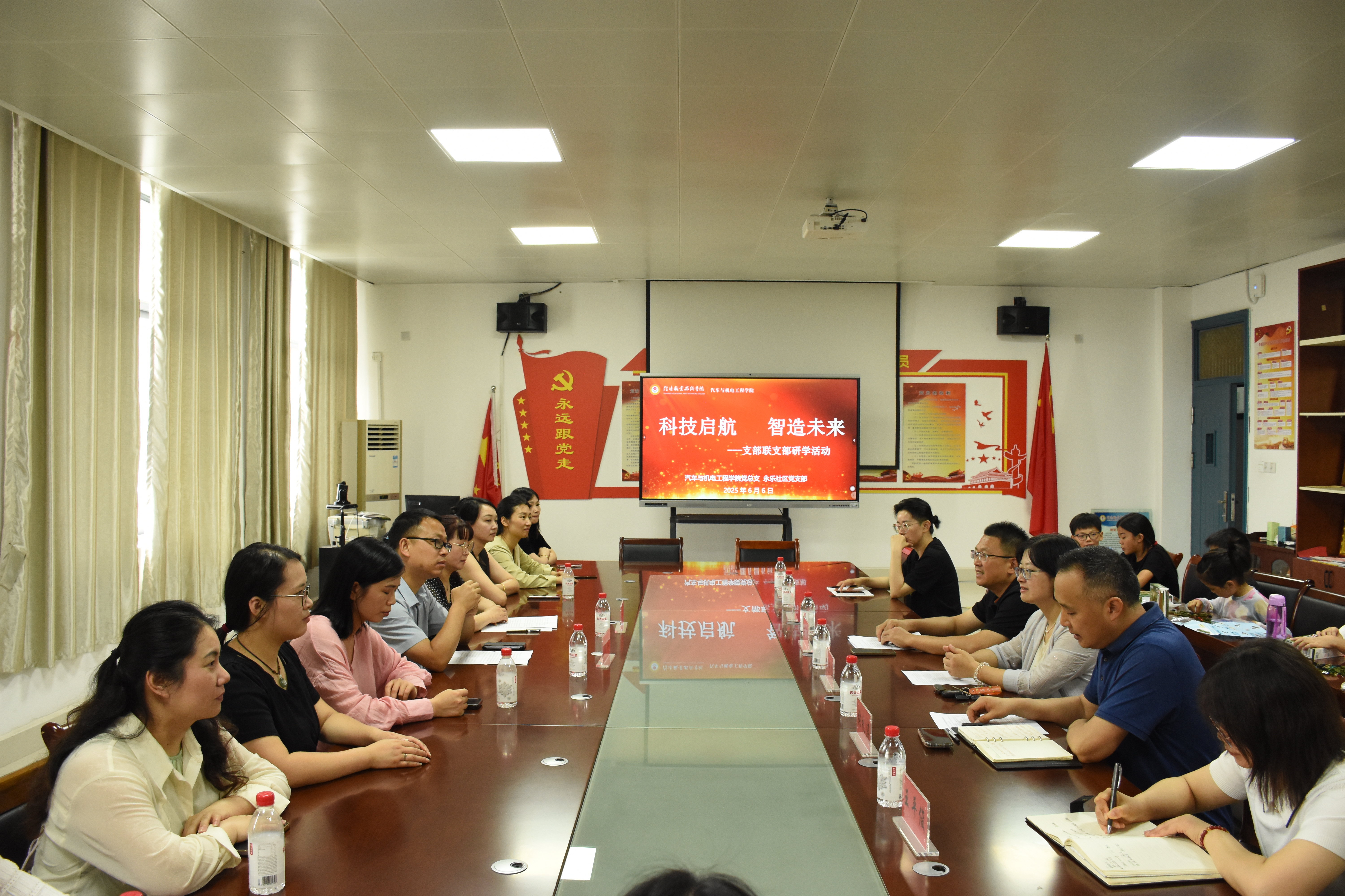 研学后,双方开展座谈交流。汽电学院朱书记为研学及后续联建指明方向;永乐社区燕书记肯定此次沉浸式科技体验与校社互联实践;南京路街道办事处黄委员建议从多方面深化 “支部联支部” 工作。小朋友分享参观感悟,以唱歌表演传递积极力量,随后获颁奖品。最后,学生处处长代翔总结强调,要以 “支部联支部” 为纽带,创新活动形式,人才联育,携手开创校社共建新局面。